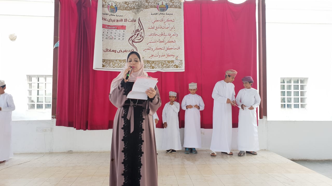 تحرص مدرسة جعلان الخاصة الاحتفال بيوم المعلم تكريم للدور الذي يقوم به المعلم في خدمة الحركة التربوية وهو حافز لكل من جد واجتهد وثابر من أجل الرقي بالعملية التعليمية وتتويج لجهود مخلصة بذلت من معلمين وتربويين فهو الانطلاقة الحقيقية نحو التميز والعطاء وبذل مزيد من الجهد والتفاني والإخلاص في خدمة أبنائنا الطلاب وتقدمت مديرة المدرسة الأستاذة نجلاء في بداية الحفل بالشكر إلى جميع المعلمين والمعلمات على امتداد مساحة هذا الوطن الغالي بأسمى عبارات التقدير والامتنان على عطائهم وعظيم بذلهم في سبيل الإرتقاء بالعملية التعليمية