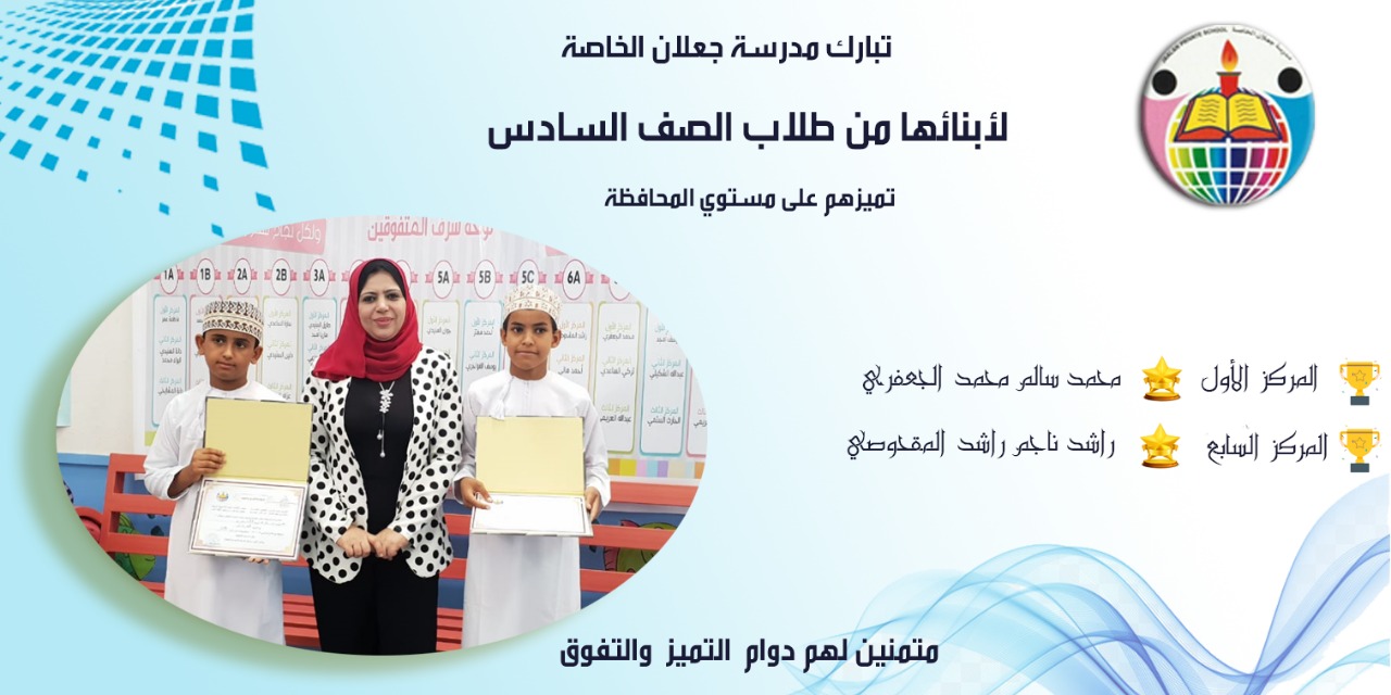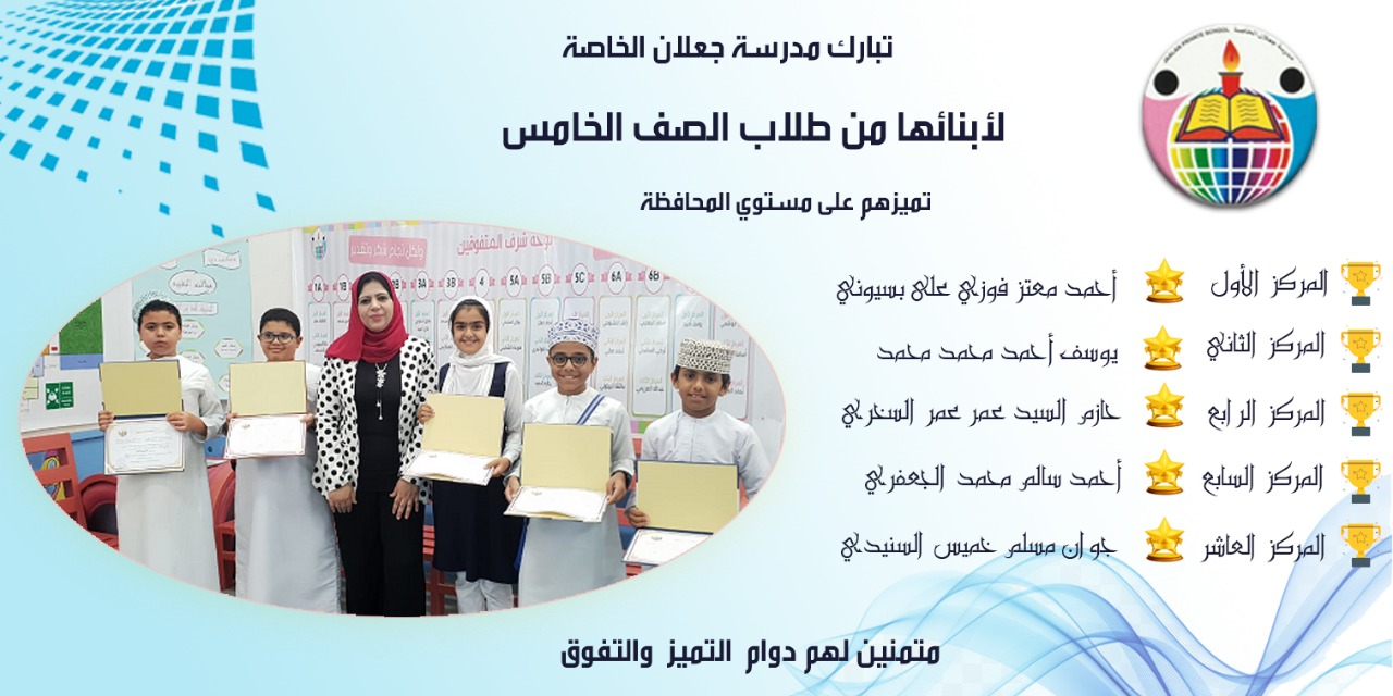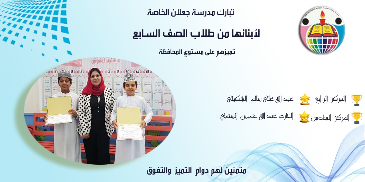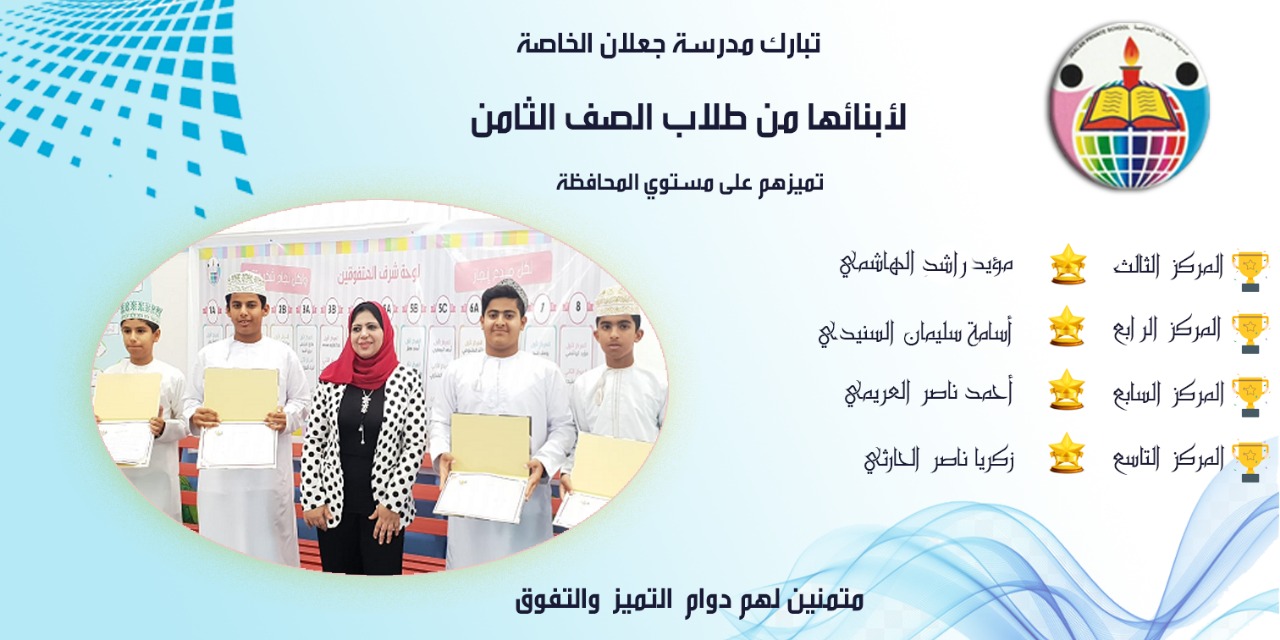وذلك احتفاء بالطلبة وتعزيزا لهم لبذل المزيد من الجهود وكان لطلاب وطالبات جعلان الخاصة النصيب الأكبر من هذا التكريم حيث تصدر أكثر من ثلاثة عشر طالب وطالبه قائمة العشرة الأوائل على مستوى المحافظة للمدارس الآحادية من الصفوف الخامس إلى الثامن ، ليواصل تكريم الطلاب على مستوى المحافظة في الأنشطة المكملة للتعليم ، يأتي هذا النجاح والتفوق بفضل الله تعالى أولاً ، ثم بفضل الامكانيات المتاحة لدى المدرسة من صفوف نموذجية ومختبرات علمية ومرافق رياضيه متعددة ، والهيئة التدريسية الذين بذلوا الكثير من الجهد والتفاني طوال الفترة الماضية من عملهم في صروح العلم الشامخة ، و التطوير في بيئة أخوية ترجمت أروع معاني التعاون والتواصل وأثمرت العديد من المنافع التي ساهمت في تنمية العمل التربوي.