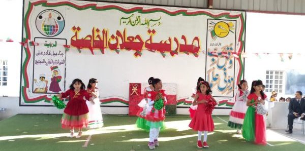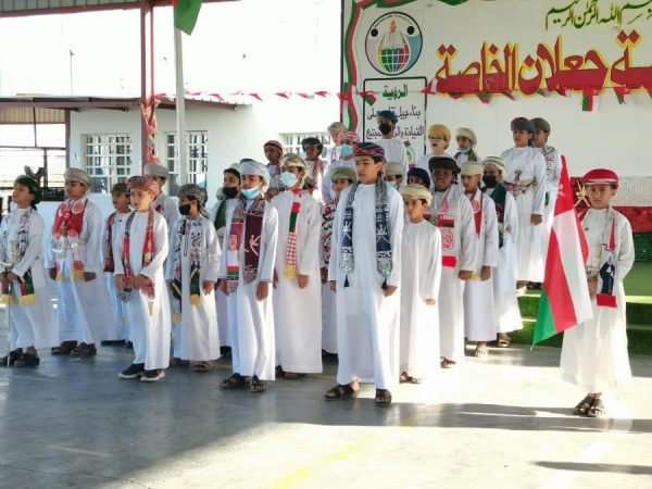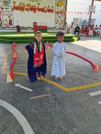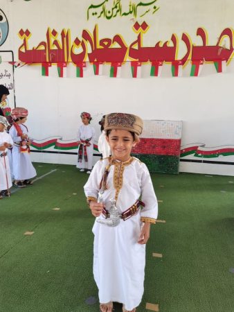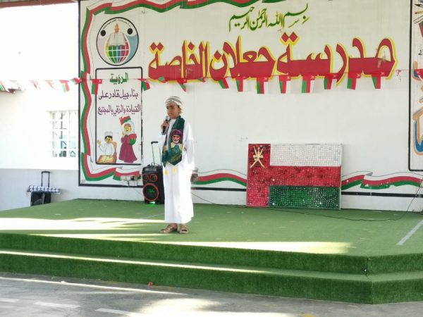 حيث احتفلت مدرسة جعلان الخاصة  يوم الخميس  الموافق25-11-2021 م بالعيد الوطني الواحد و الخمسون  المجيد  أعدت  من خلاله معلمات الإذاعة  برنامجا إذاعيا أُعد بهذه المناسبة العظيمة    بدأ البرنامج بتلاوة عطرة من آيات الله الكريمة ومن ثم الحديث الشريف … و بدأت فعاليات الحفل بتنوع فقرات الحفل  بعرض التلاميذ مجموعة من الرقصات الشعبية منها رقصة البرعة ورقصة الربوبة  وقد أدت مجموعة من التلاميذ رقصة خليجية نال على إعجاب وتفاعل قوي من الحضور …… وقد عبر تلاميذ مدرسة جعلان الخاصة  عن ولائهم وحبهم لقائدنا المفدى جلالة السلطان  هيثم بن طارق ال سعيد  بمجموعة من القصائد والأناشيد الوطنية …. وقد ألقت  أ.هدى الصواعيه  المديرة كلمة بهذه المناسبة العظيمة هنئت فيها معلمات المدرسة والتلاميذ بالعيد الوطني الواحد والأربعين المجيد….  وفي نهاية الحفل رفع تلاميذ المدرسة أيديهم إلى السماء داعين الله عز وجل أن يحفظ الله عماننا الحبيبة وقائدنا المعظم وان يعم الأمن والأمان في أرجاء وطننا الغالي …..